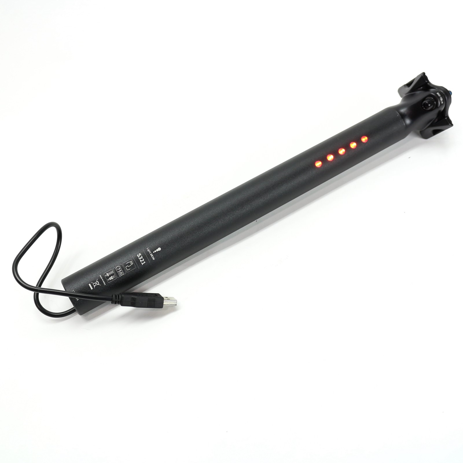 Five bright LEDs integrated into the back of the seatpost shine in 4 different patterns.
