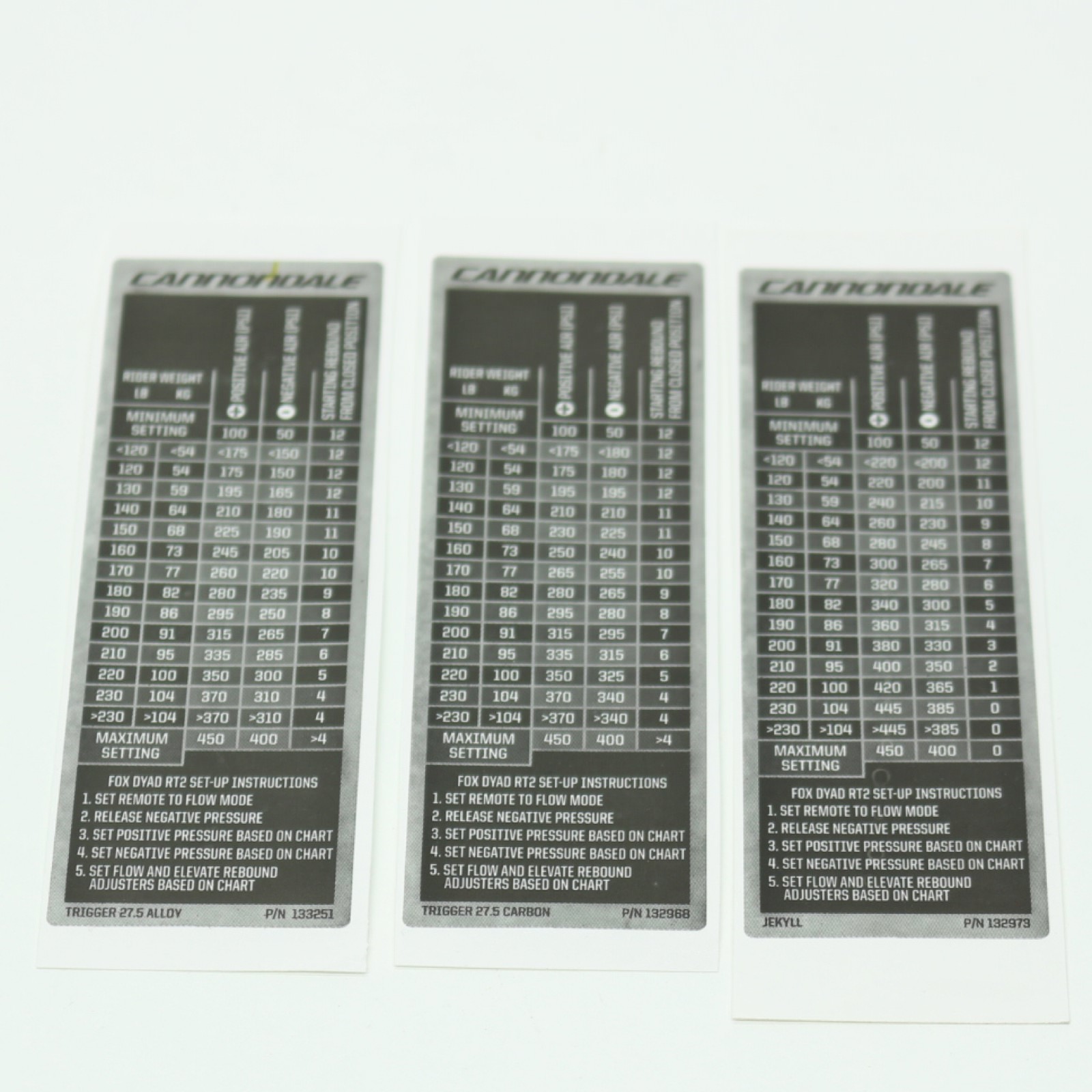 Original Cannondale air pressure chart stickers for DYAD rear shocks.