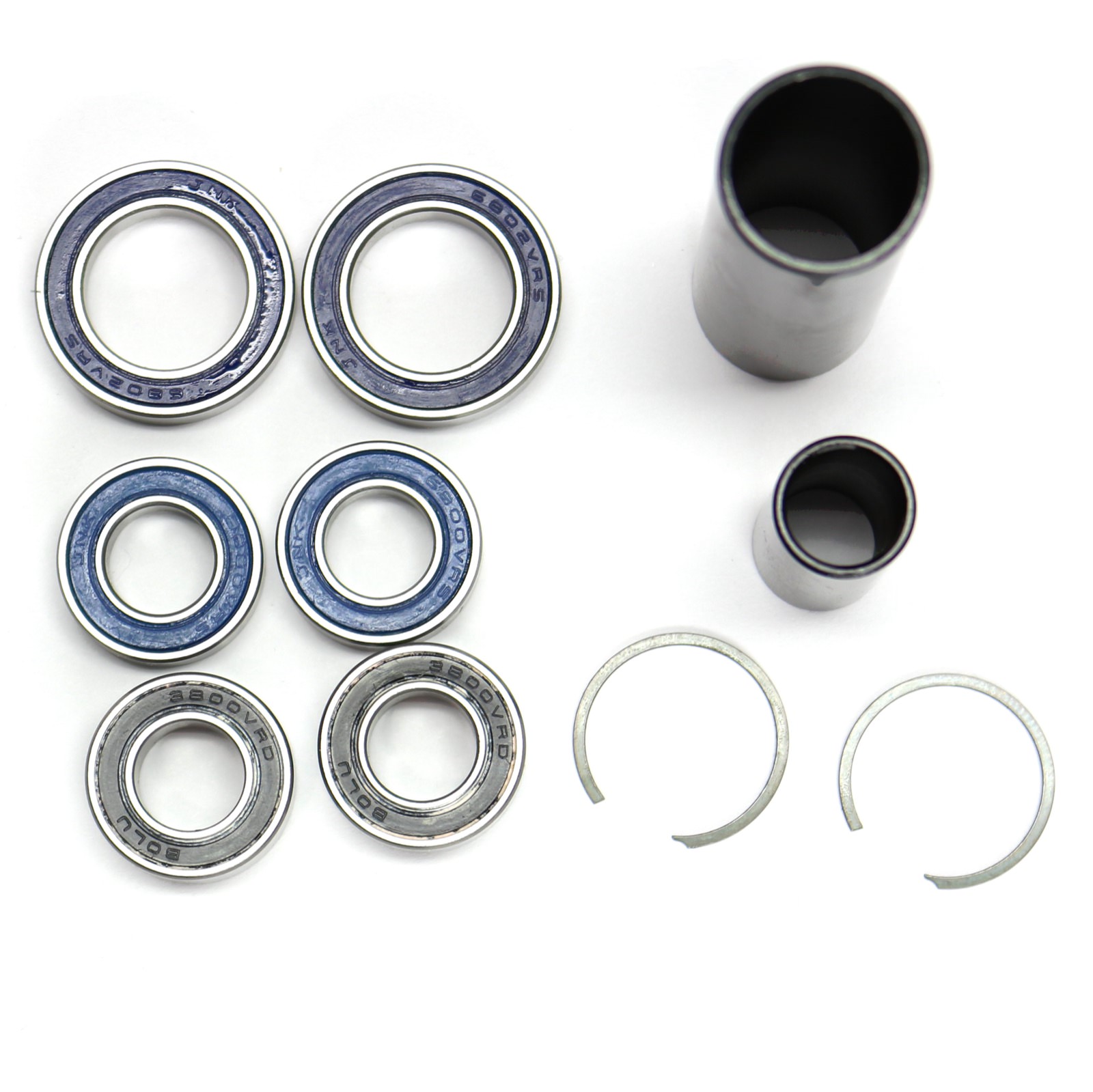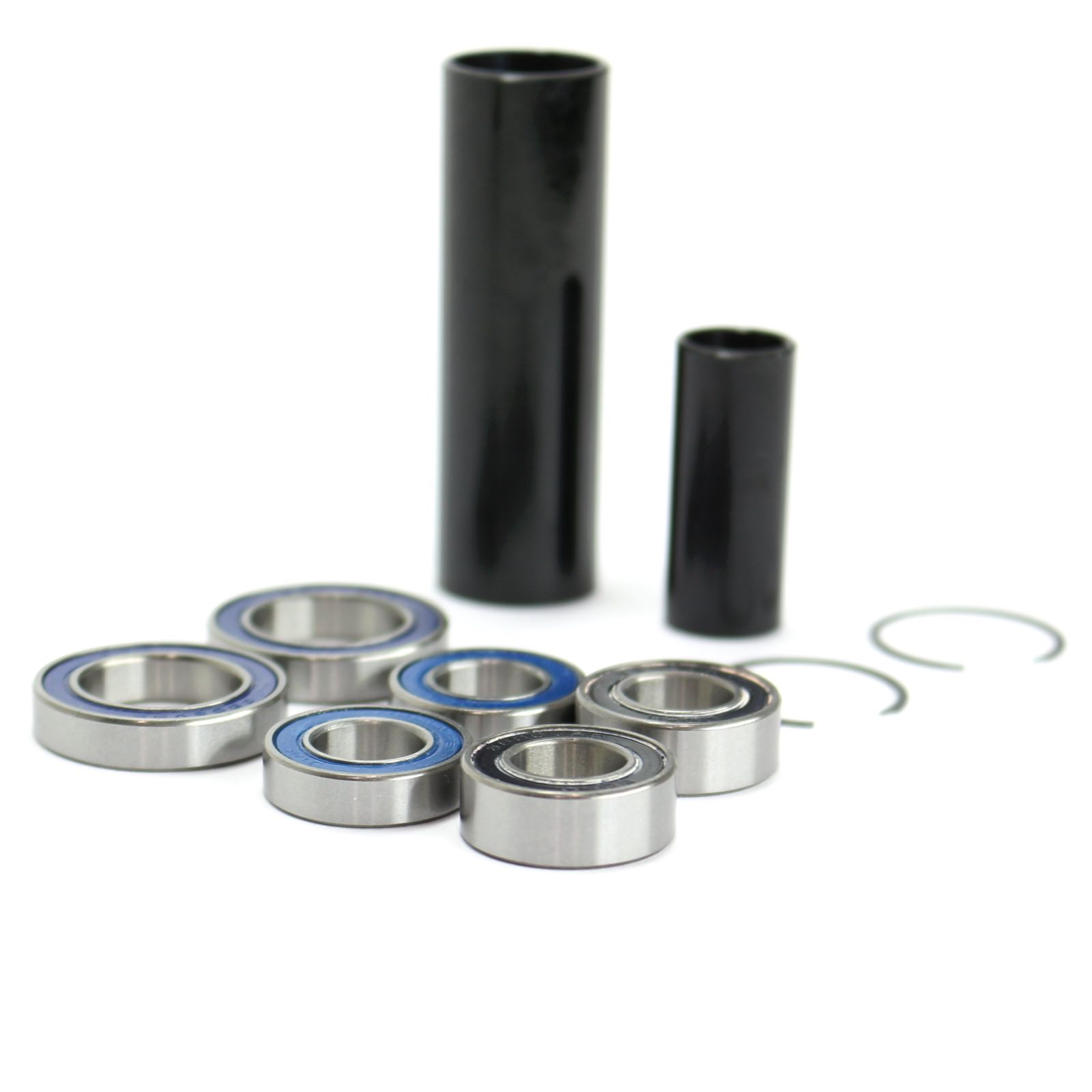 - Kit includes two axles, two each of three bearing sizes, and two clip rings.