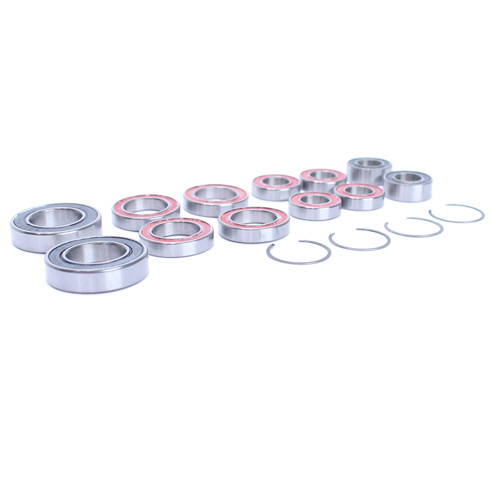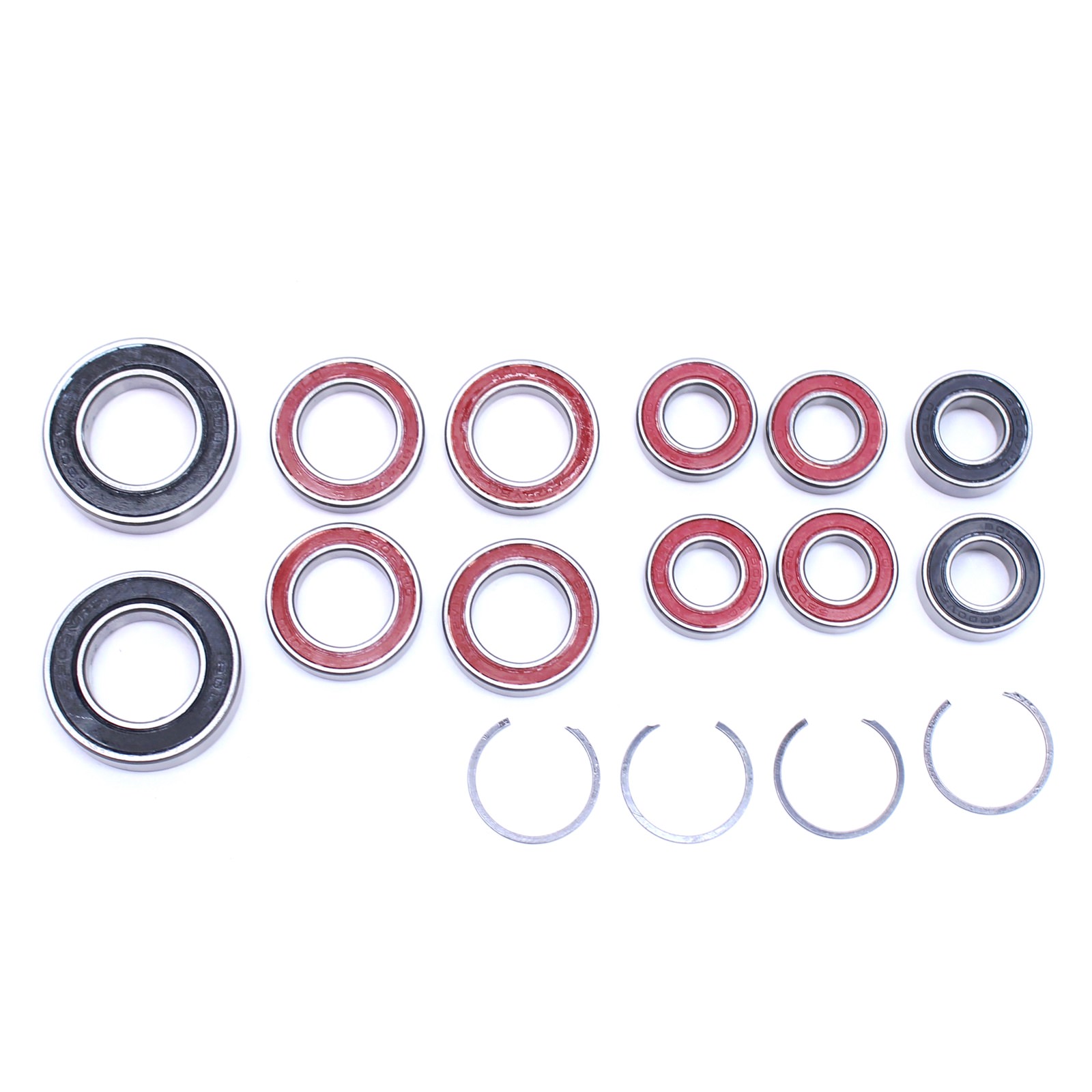 Kit includes 12 various bearings and 4 circlip retainers for a full replacement set on the rear suspension.