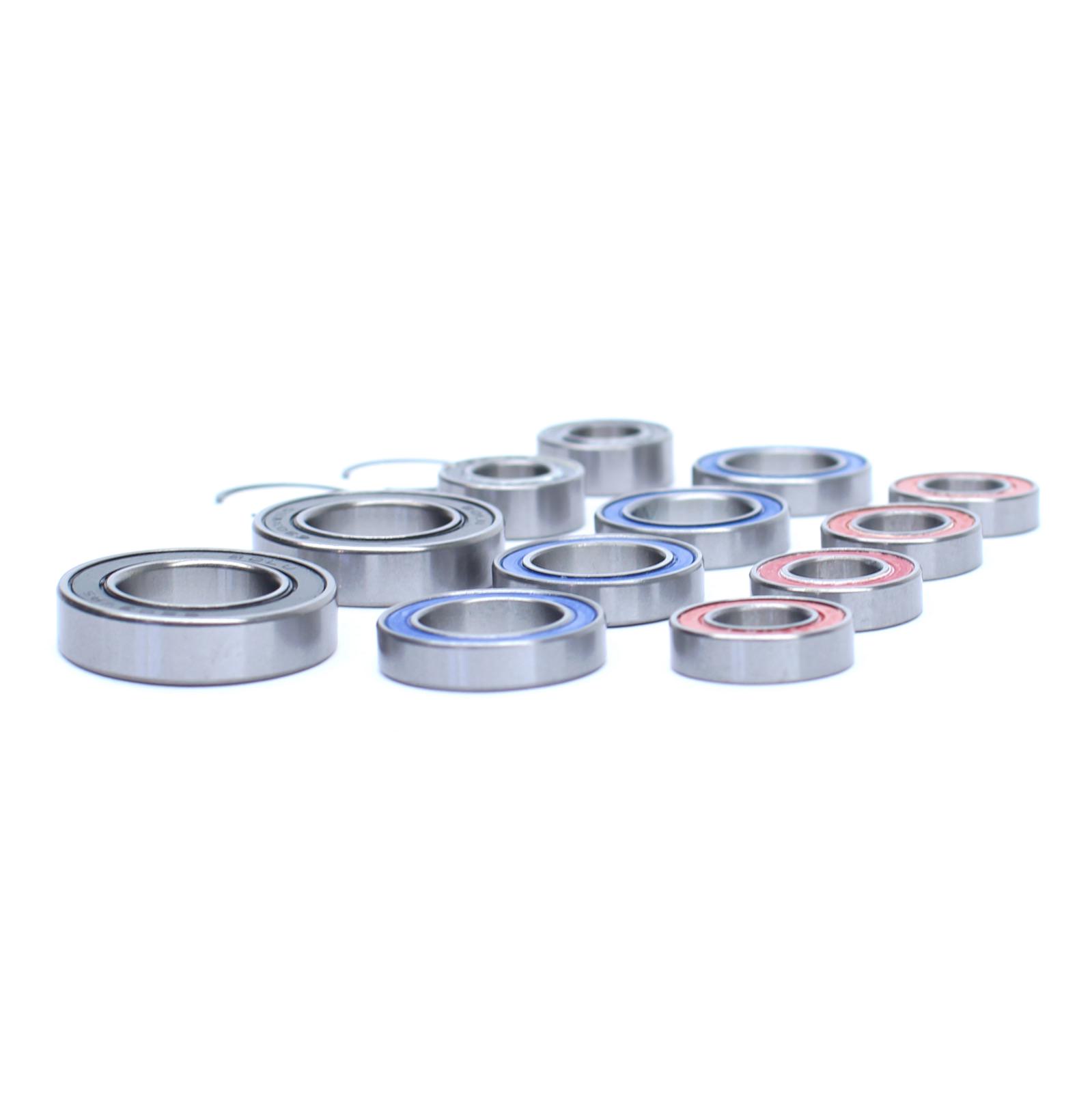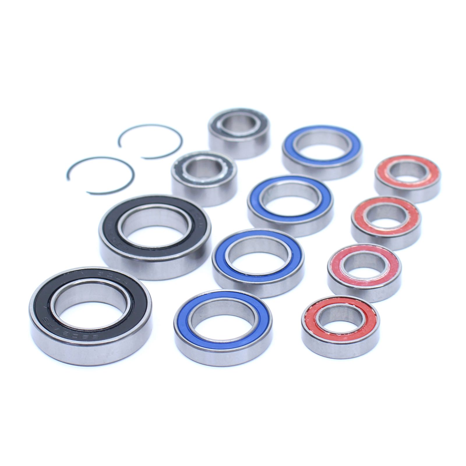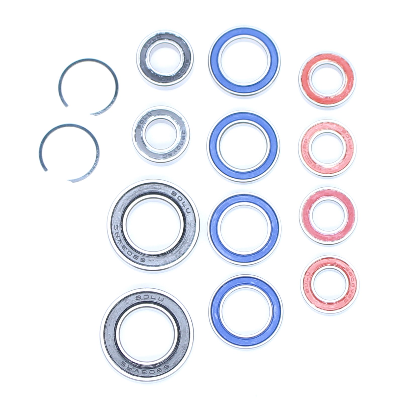 Kit includes 12 various bearings and 2 circlip retainers for a full replacement set on the rear suspension.
